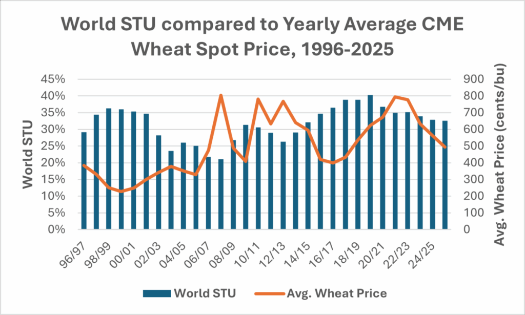 Az alábbi ábra a USDA/WASDE becslését mutatja a globális STU arányokról, amelyre rá van vetítve a CME spot (chicagói azonnali) búzaárak éves átlagértékét mutató vonal. Ez azt mutatja, hogy az STU-nak van egyfajta, de nem exakt, ok-okozati kapcsolata van az árral. A valóság gyakran torzítja a gazdasági elmélet alapján várható tökéletesen függvényszerű kapcsolatokat.