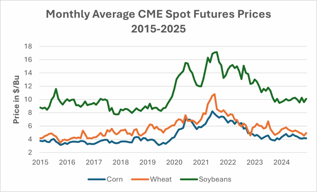 Figyelembe véve a gabonapiac visszafogott hangulatát és a világszerte megnövekedett termelést, a búza ára nem tűnik túlzottan eltérőnek a hasonló STU-val rendelkező évektől. Ahhoz, hogy a búza ára tartós emelkedést mutasson és áttörje a kulcsfontosságú ellenállást, valószínűleg jelentős időjárási eseménynek kell bekövetkeznie az egyik fő termelő régióban. A búzaárak emelkedésének másik lehetséges útja az általános mezőgazdasági termékek kereskedelmét elősegítő kereskedelmi megállapodások megkötése. Ha a kukorica és a szójabab ára emelkedne, a búza valószínűleg követné őket, ahogy az alábbi ábra is mutatja.