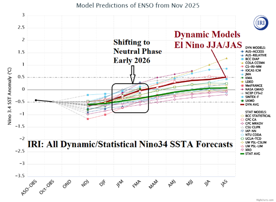 Sajnos nincsen a látóhatáron olyan tényező, ami érdemben tudná befolyásolni a terménypiacot, azt a terménypiacot, ami strukturális problémákkal küzd és fog is még küzdeni – 2025. december 8. , csak az időjárás, ami a kínálati oldalon vesz el az egyes termények termelési szintjéből a világ különböző régióiban. Ha nincsen olyan globális időjárási következményekkel bíró időjárási jelenség, mint az El Nino vagy a La Nina, akkor nem hagyatkozhatunk másra, mind rövid- és középtávú időjárási előrejelzésekre, amik jó esetben is csak hetekre, legfeljebb három hónapra tudnak trendeket felvázolni, ami azért kevés ahhoz, amikor nagymennyiségű betárolt terménnyel rendelkezünk és több bizonyosságot szeretnénk ennél hosszabb időtávra. Viszont, mint fentebb a minap megjelent thaiföldi cikkben írtak abban a régióban, ami a leginkább ki van téve az El Ninonak és a La Ninanak alapoznak egy idei El Ninora.