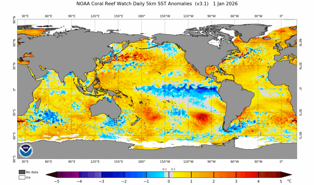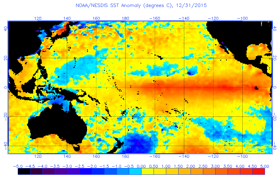 Látható a NOAA 2015. január 5-ei műholdfelvételén, hogy már melegebb volt az egyenlítő Csendes-óceán vízfelszíne, nemhogy La Nina legyen: