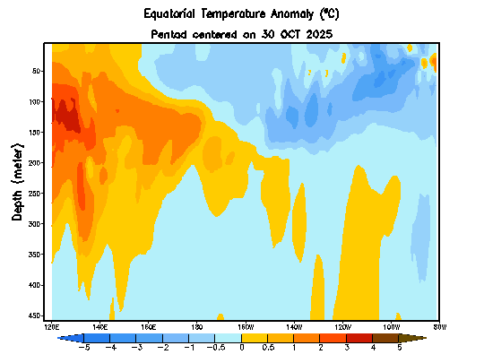 A lentebbi animáció, ami 450 méter mélyen, de több ezer kilométert fog át, jól látható, hogy az El Nino kialakulását jelző meleg áramlatok törnek lassan keletre és fölfelé megszüntetve a jelenlegi La Ninat: