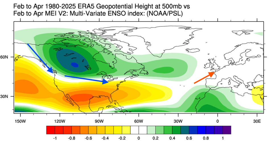 Az Északi-Csendes-óceánon kialakult magasnyomású terület lehetővé teszi, hogy egy alacsony nyomású terület alakuljon ki Kanada felett, valamint az Egyesült Államok északi és középső részén. Ez általában egy északabbra irányuló áramlást eredményez, amely hidegebb/hűvösebb levegőt szállít az Egyesült Államok északi felébe. Ez azonban melegebb áramlást eredményez Európában.