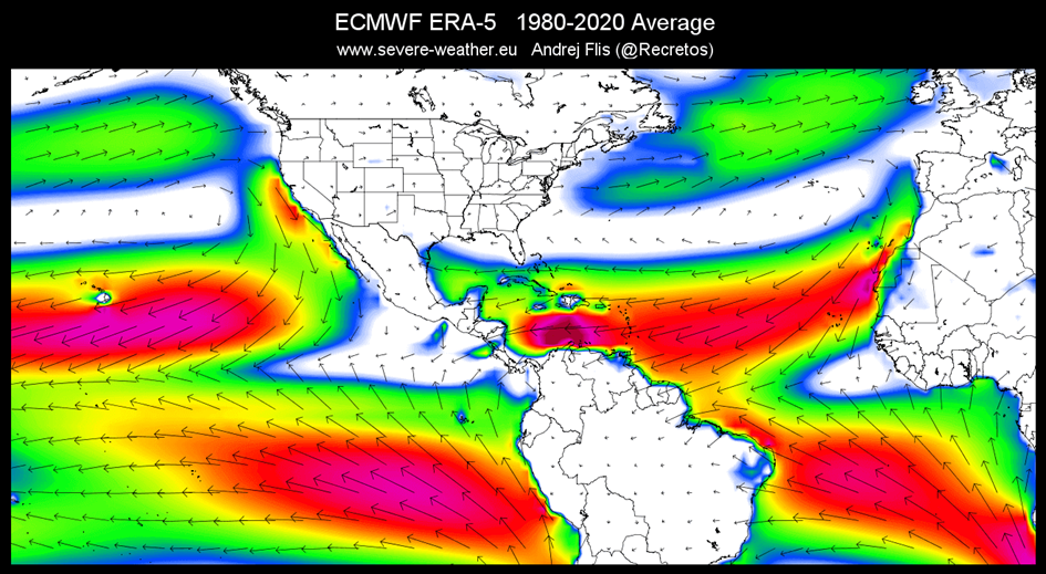 Az alábbi térképünk a felszín közelében uralkodó szeleket mutatja, az elmúlt 4 évtized tényleges adatai alapján. Jól láthatóak az Atlanti-óceánban és a Csendes-óceánban a keleti passzátszelek, amelyek hozzájárulnak az ENSO régió felmelegedéséhez és lehűléséhez.