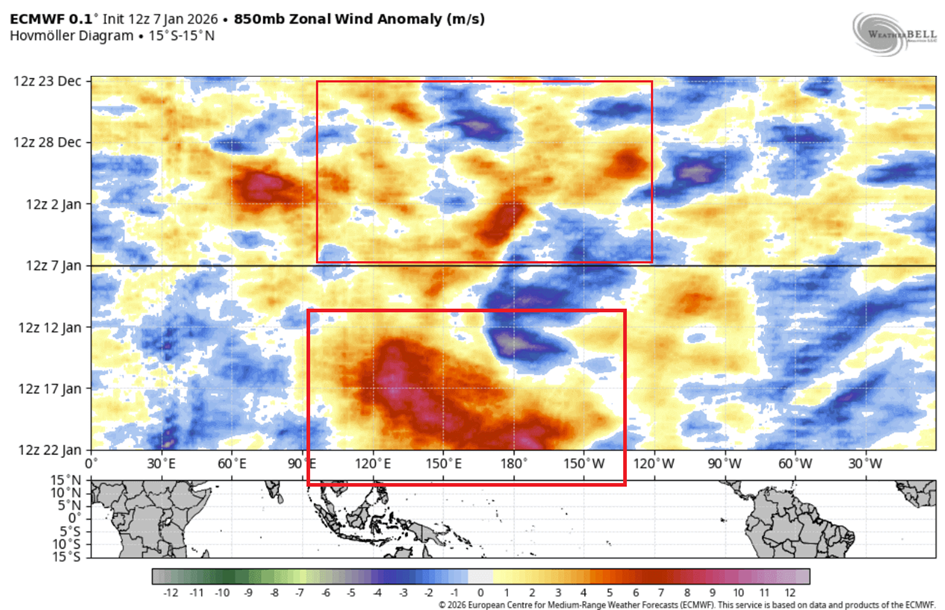 Az alábbiakban látható az ECMWF trópusi régiókra vonatkozó zónás szél előrejelzése. A felső rész az elmúlt két hét elemzését mutatja, és már láthatóak a nyugati-közép ENSO régiókban az elmúlt napokban bekövetkezett nyugati szél anomáliák. De a fő esemény a január második felére vonatkozó előre jelzésben látható az alsó részen.