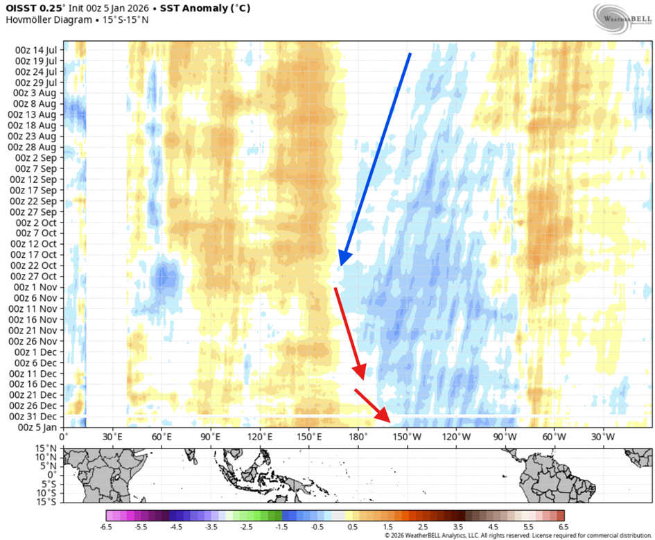 Az óceán felszíne alatt is jelentős változás zajlik. Az alábbi kép a trópusi Csendes-óceán felszíne alatti hőmérsékleti anomáliákat mutatja. Nyugaton, körülbelül 100–250 méter mélységben egy nagy meleg víztömeg látható. Ez egy másik oka annak, hogy a La Niña nyugatról kezdve gyengül, mivel ezek az anomáliák a felszín alatt terjednek.