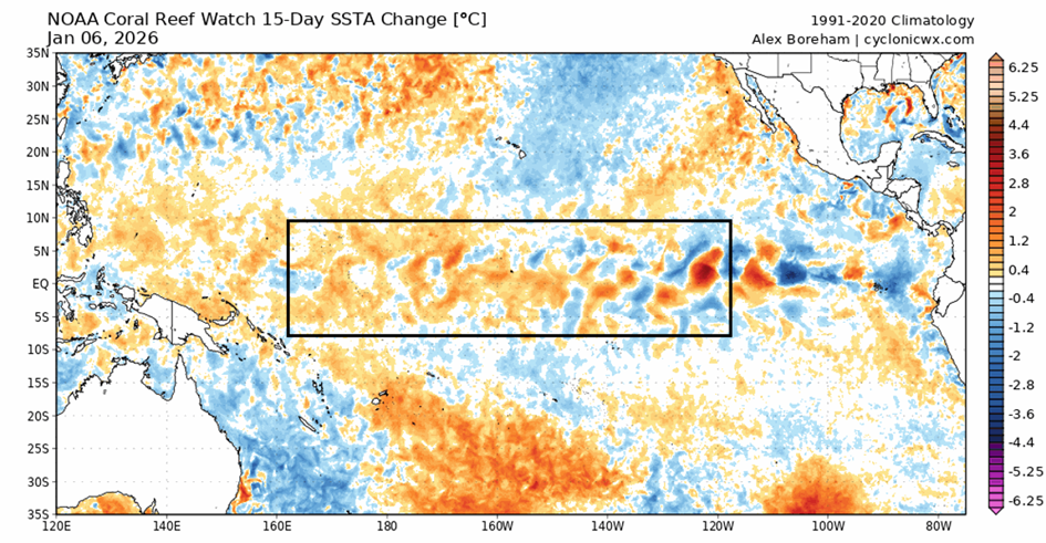 Az alábbiakban látható a legfrissebb 15 napos óceán hőmérséklet-változás, amelyen látható a melegedési tendencia az ENSO nyugati és középső régióiban. A keleti részeken még mindig van némi keveredés, de úgy tűnik, hogy a La Niña végének kezdete nyugatról indul, és az elkövetkező hetekben fokozódni fog.