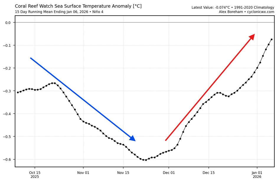 Ezt megerősíti az alábbi ENSO 4. régió (nyugat) elemzés, amely az elmúlt 3 hónap anomália adatait mutatja. A La Niña hűvös időjárása jól látható, november végén érte el csúcspontját. Azóta azonban az ENSO hőmérsékleti anomália gyorsan emelkedni kezdett, és ez a tendencia folytatódni fog, mivel a következő hetekben nyugati szél erősödni fog a régióban
