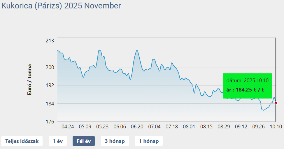 A novemberi szállítású kukorica ára a párizsi árutőzsdén, technikai mozgás mellett, de az aratási nyomásnak köszönhetően csökkenő tendenciában van már jó ideje:
