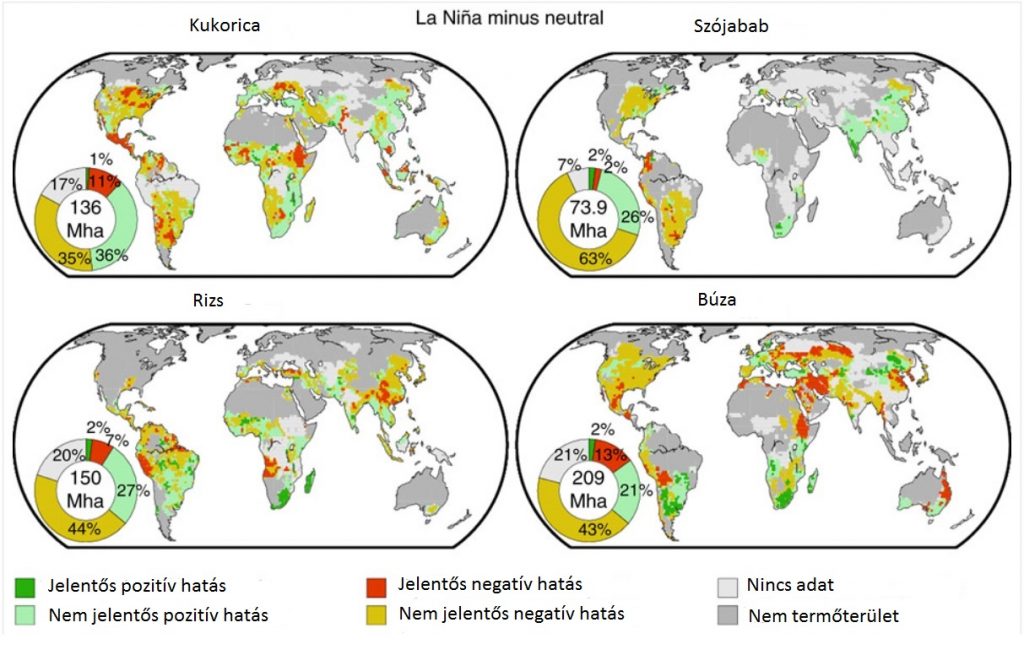 A Nature magazin, a világ egyik legrangosabb tudományos folyóiratának lassan 20 éve kiadott publikációja igyekszik bemutatni a La Nina hatását az egyes terményekre. Ezt a 2000-et megelőző 50 év La Nina jelenségeinek adatsoraiból számolták. Rögtön hozzá kell tenni, ha ránagyítunk, jól látható, hogy akkor még világos szürkével jelölte Lengyelországot kukoricatermésztés szempontjából, ami azt jelenti, hogy akkoriban még nem is minősült kukoricatermő régiónak. Ma pedig már tudjuk, hogy gyakorlatilag a mi korábbi klímánkat kapta meg Lengyelország területének 2/3-a. De jól mutatja, hogy Dél-Amerikában és ez azóta sem változott, hogy dél-amerikai kukoricatermésre túlnyomó többségében negatívan hat a La Nina. Itt meg kell jegyezni azt is, hogy mivel téli La Ninaról beszélünk, a többi térkép félrevezető lehet, mivel búzára csak akkor hat ki például az északi félgömbön, ha a La Nina elhúzódik. Az idei La Nina várhatóan február végéig tart csak.