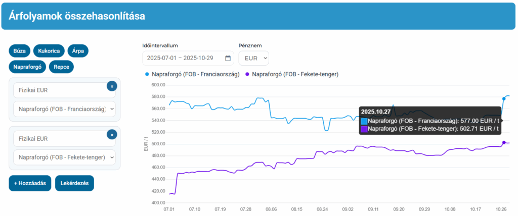 Az AgriMarket.hu oldalon hamarosan elérhető új, az egyes termények árainak összehasonlítására képes eszközön még jobban látható, hogy az EU-s napraforgó árak hogyan emelkedtek a fekete-tengeri napraforgó árakhoz képest. Különösen jól látható, hogy az árkülönbség csökkent a nyár elején, ez már magában hordozta az EU-s napraforgó árának az emelkedését, de az utolsó lökést a fentebbi cikkekben taglaltak hozták: