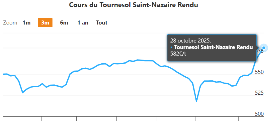 Hogy a napraforgó sérülékenyebb helyzetben van, mint a többi olajos növény és gabona, az jó ideje látható már, mivel az 2025/26-os értékesítési év végére olyan alacsony lesz – 2025. június 30. , mint az előző évben, amikor az árak tavaly ilyenkor igencsak felszöktek. Az is, hogy a nyár aszály az ukrán napraforgó termés nagyobbik részében komoly károkat okozott – 2025. szeptember 28. , illetve az is, hogy az elmúlt hetekben esősre fordult az időjárás, viszont, hogy ez utóbbi nem csitul és Ukrajnában el fog maradni majd 1 millió tonnával a termés a korábbiaktól, akkor, amikor számolt ezzel az a világpiac, amin ezek a már eleve magas árak azért alakultak ki, mivel látták a hosszabb távú kockázatokat az értékesítési év végére várható alacsony készletek miatt.