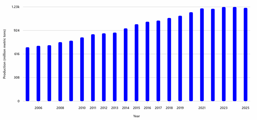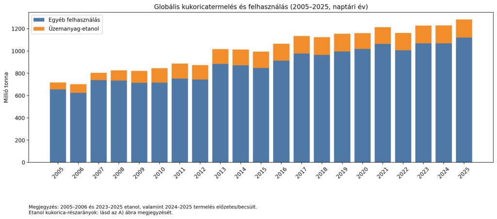 A termelési szint trendszerűen nőtt, voltak gyengébb évek az egyes régiókban a helyi időjárásnak köszönhetően, de a termelés nőtt, a kereslet fennmaradt. Az USA-ban 2000-ben a teljes kukoricatermelésnek csupán 6%-ából lett üzemanyagcélú etanol, 2005-ben már 15%, 2024-ben pedig legalább 38% és mindezt úgy, hogy az amerikai összkukorica termelés 20 év alatt drasztikusan emelkedett. A globális kukoricatermelés a 2005-ös 650 millió tonnáról gyakorlatilag megduplázott már 2023-ra, ami azt jelenti, hogy minden évben több kukoricát termel a világ pluszba 2005-höz képest, mint a kontinentális Európa (EU és a volt Szovjetunió európai területei) 5 év alatt összesen megtermel (!). Ez óriási szám és minden évben megtermeli a világ többletként a 20 évvel ezelőtti szinthez képest.