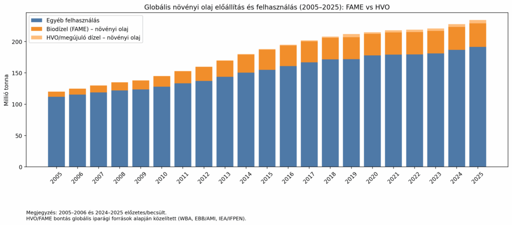 Hasonló a helyzet a növényi olajokkal (pálma, szója, repce, napraforgó, stb.), aminek az összvolumene megduplázódott 20 év alatt, de a bioüzemanyag részarány is jelentősen növekedett, viszont a biodízelé nem, az ún. HVO-jé (hidrogénezett növényi olaj) viszont növekedésnek indult. A HVO-ról, tekintettel annak fontosságára külön elemzésben fogunk írni.