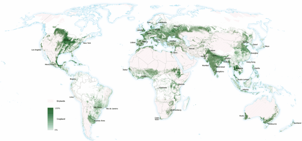 A lentebbi képen a föld jelenleg a szántóföldi növénytermelésbe bevont területeit mutatja. Jól látszik, hogy Európában már nem nagyon van hova terjeszkedni, viszont a tudományos anyagok további bevonható területeket tart számon Oroszországban, főleg a klímaváltozással tolódnak ki területek északabbra és Szibéria felé, illetve Dél-Amerikában.