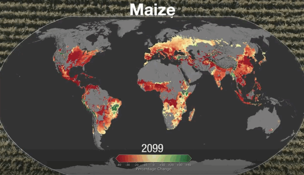 Lentebb 2099-re a globális felmelegedés miatt a Kárpát-medencében a jelenlegi/potenciális hektáronkénti hozamokhoz képest további legalább 40%-kal fog csökkeni a kukorica hozama. Ugyan ez máshol sem javul és ez nagyon hosszú idő, sok innováció jöhet, de szinte biztos, hogy a kukorica szerepe nagyjából a mai dél-romániai és bolgár vetésterület részarányra kell csökkennie országosan (cca. 15%), és lesznek/vannak olyan térségek Magyarországon, ahol szinte fel kell hagyni a termesztésével.