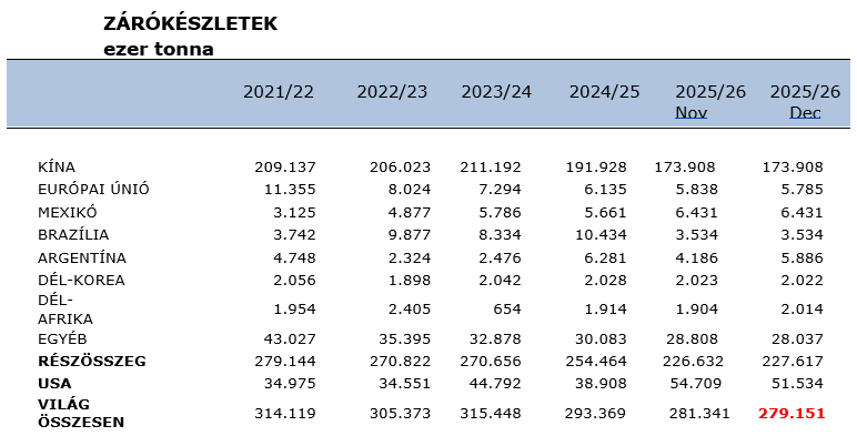 Az USDA az Egyesült Államok végső készleteit változatlanul 901 millió vékában hagyta.