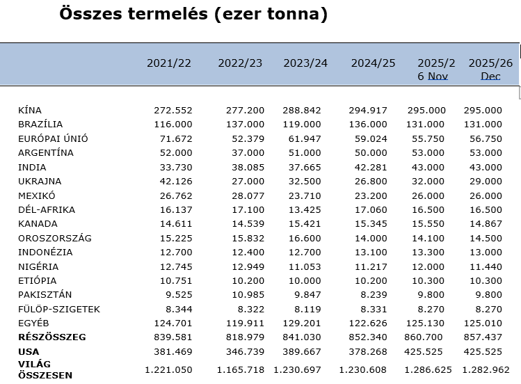 A decemberi USDA jelentésben a globális kukorica termelésre vonatkozó, országokra lebontva és aggregáltan: