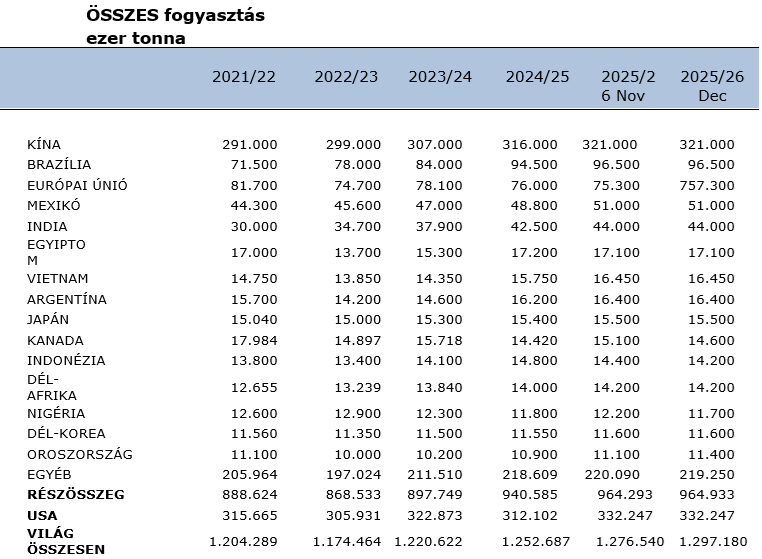 Az USDA ugyanezen decemberi jelentésének, a kukorica globális felhasználására vonatkozó számok országokra lebontva és aggregáltan: